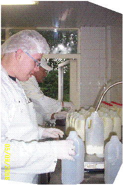 Zo wordt bij ons de karnemelk in flessen gevuld.