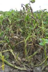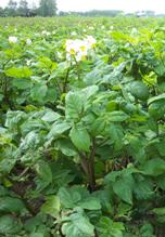 Onze aardappelen kunnen minder goed tegen de nattigheid. Doordat het gewas steeds nat blijft en de temperatuur relatief hoog, is het gewas zeer vatbaar voor de alom gevreesde fytophtora schimmel. Dit is een schimmel die het blad zodanig aantast dat de plant helemaal bruin wordt en niet meer verder kan groeien. En na al deze regen zit er dus behoorlijk fytophtora in onze aardappelen. Terwijl de aardappelknolletjes onder de planten nog veel te klein zijn, ze moeten eigelijk nog wel een maand groeien. Maar de schimmel breidt zich erg snel uit.